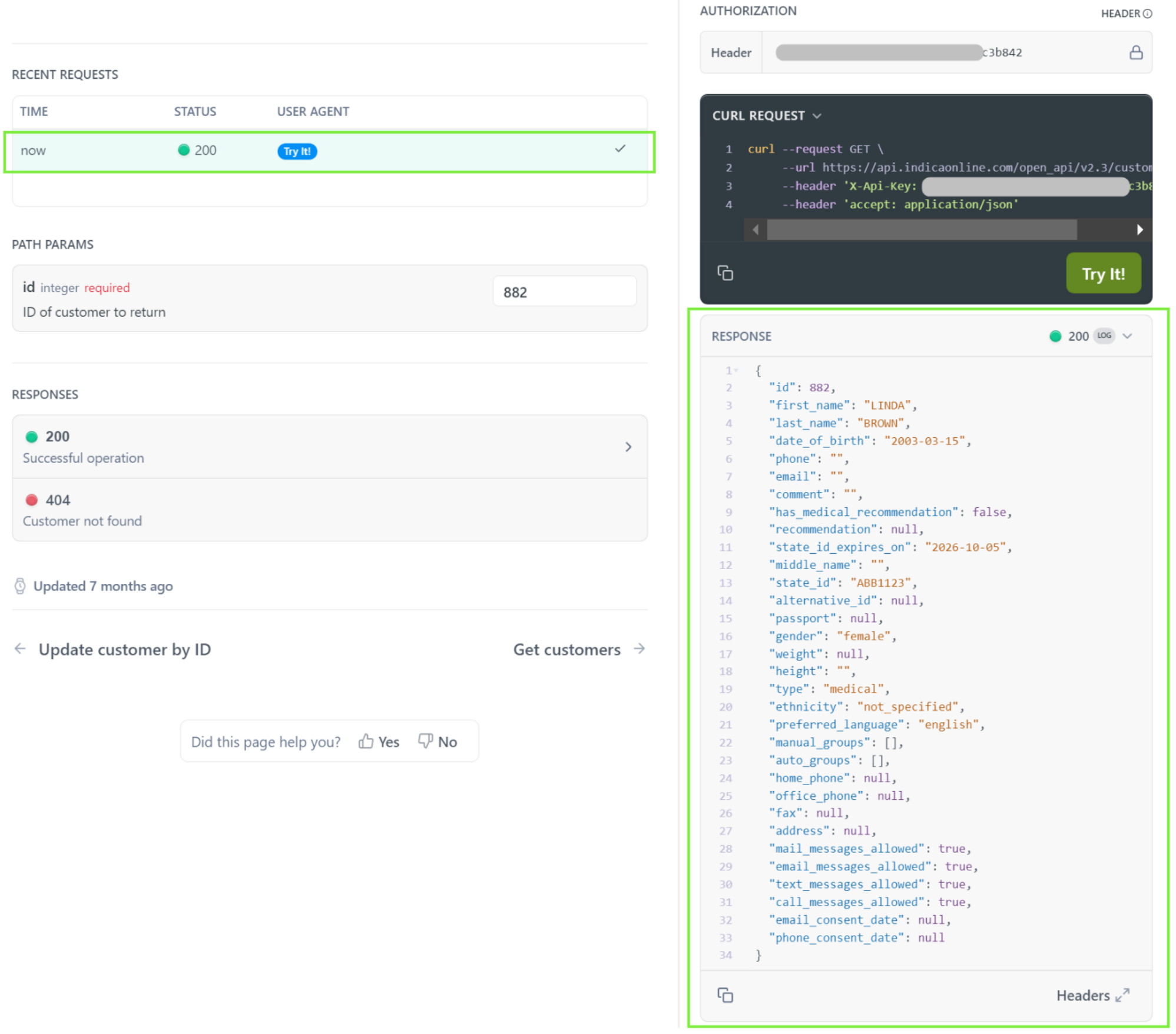 Step 2: Specify the customer_id you are interested in and send the request. IndicaOnline will return a 200 status code with the current customer data.